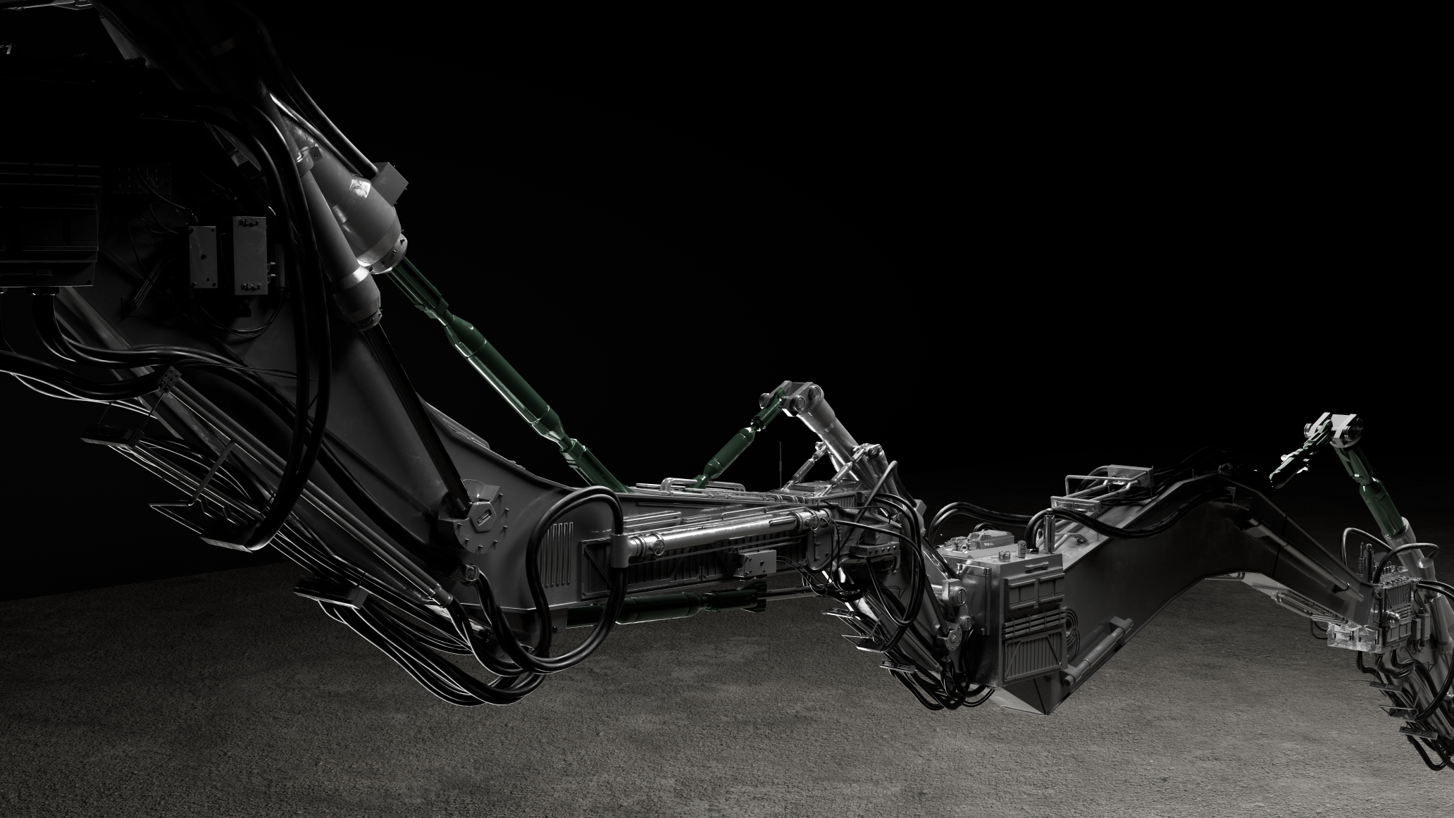 The project is a study in structural complexity and aesthetic contrast. The robotic arm was engineered with an immense level of detail, featuring thousands of individual hydraulic components and intricate cable simulations that heighten its mechanical realism. While the asset’s textures remain intentionally raw with a palette of deep grays and muted forest greens, the "magic" lies in the lighting and environmental storytelling. From a stark, studio-focused presentation of the asset to its placement in a monumental hall, every frame balances technical density with cinematic atmosphere.